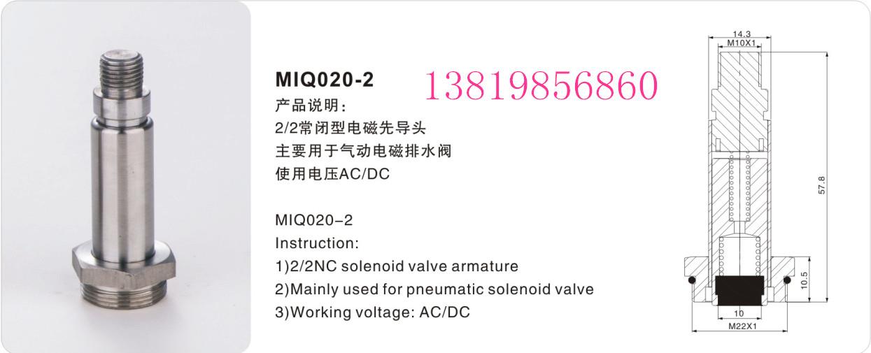 产品详情:MIQ020-2产品说明:2/2常闭电磁先导头,主要用以气动电磁排水阀,采用电压ac/dc
